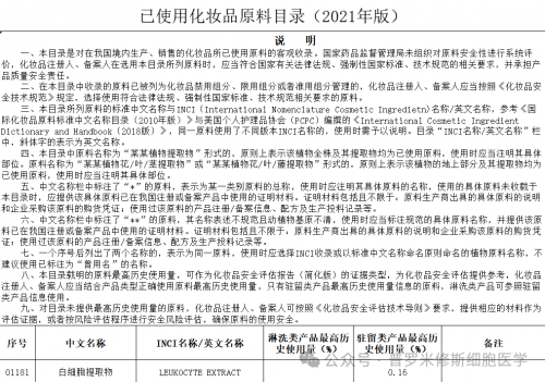 白细胞提取物(LEUKOCYTE EXTRACT)是从白细胞中提取的一种复合物,是国家药监局发布的《化妆品新原料注册备案资料管理规定》中明确列名的化妆品原料之一。
