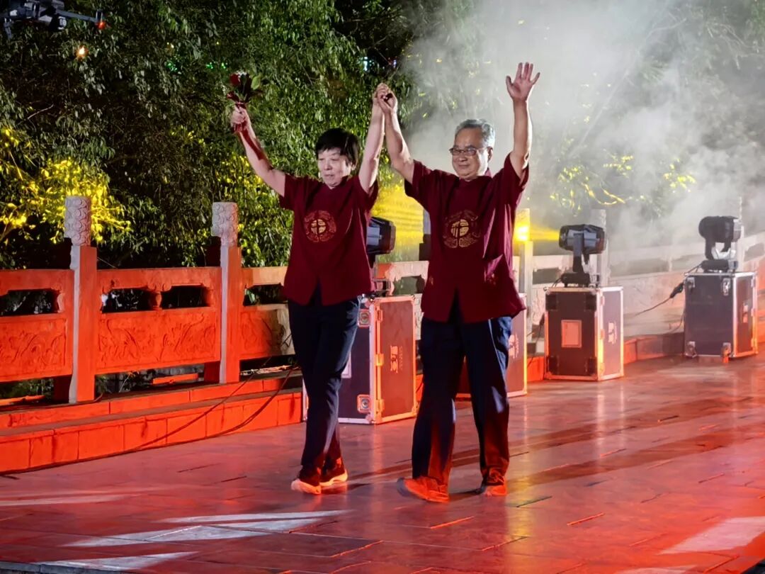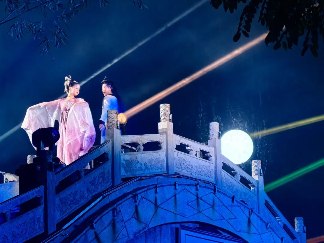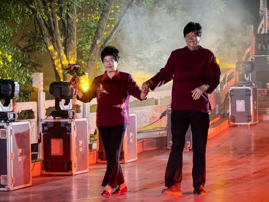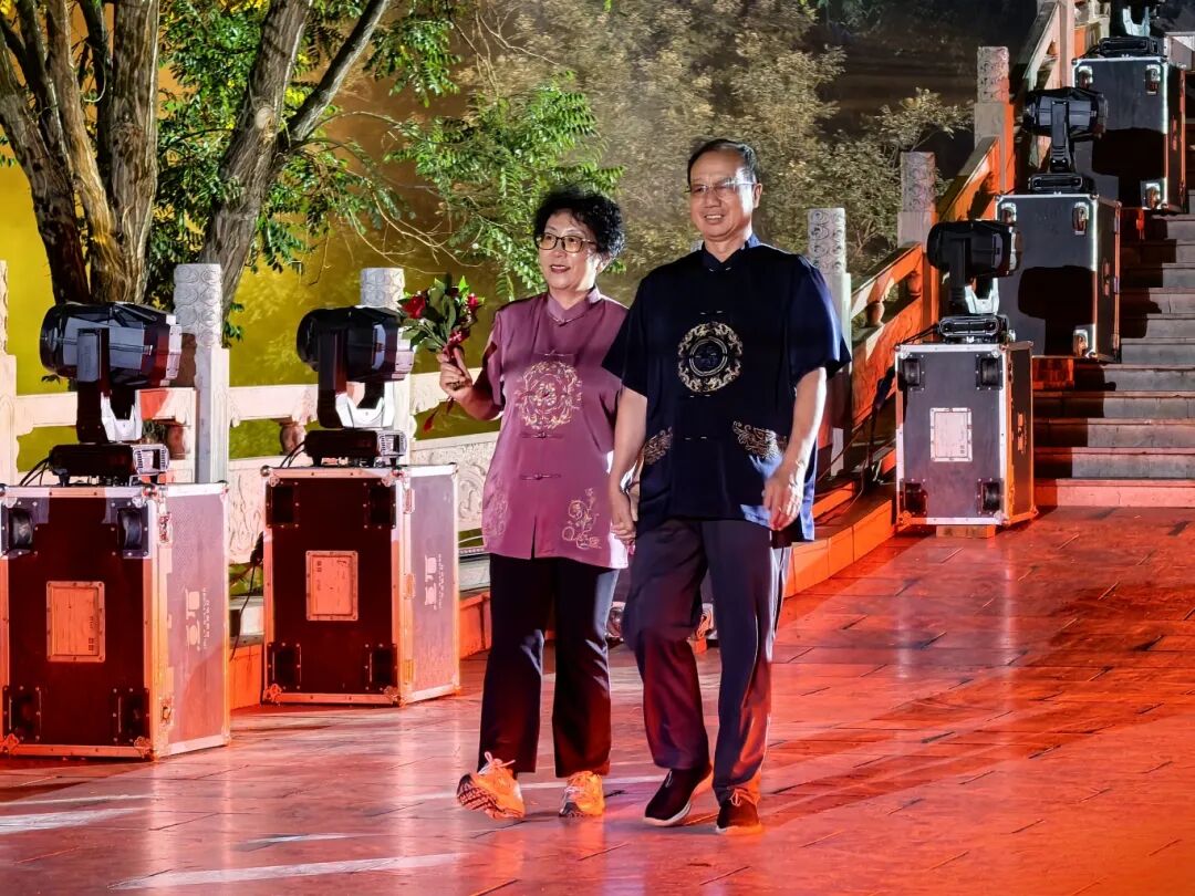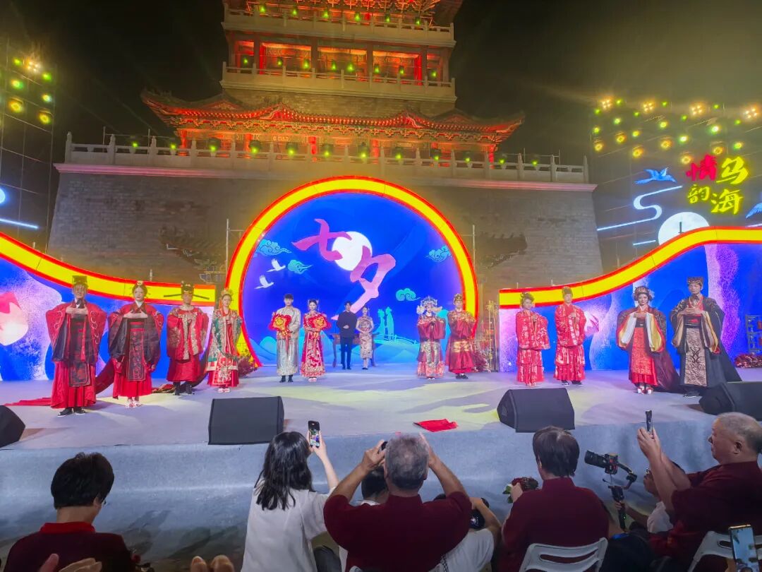 傍晚时分,一场大型婚俗大秀由诗人吟唱的诗歌《行香子 七夕》拉开了序幕。“牛郎”吹着笛子乘船而来,缓步登岸,与“从天而降的”“织女”相会在“鹊桥”中央。二人在桥上双手紧握、含情脉脉,上演了一场唯美的爱情故事。随后,代表着金婚、蓝宝石婚、红宝石婚、珊瑚婚等7对夫妻先后步入幸福大道,为大家送上爱的祝福,寓意着忠贞不渝、幸福和睦的接力棒进行交接传递,将爱情的火种和培树文明家庭的理念继续延续下去。本次实景剧演出由本地导演刘东旭出任总导演并全程执导。 活动现场精彩不断,中国各朝代婚俗大秀为大家展示了周制婚礼却扇礼、汉制婚礼合卺酒、唐制婚礼掌灯纳福等七个时期的婚俗礼仪和服饰,让大家沉浸式感受各朝代精美婚礼画面,体会传统婚俗文化。