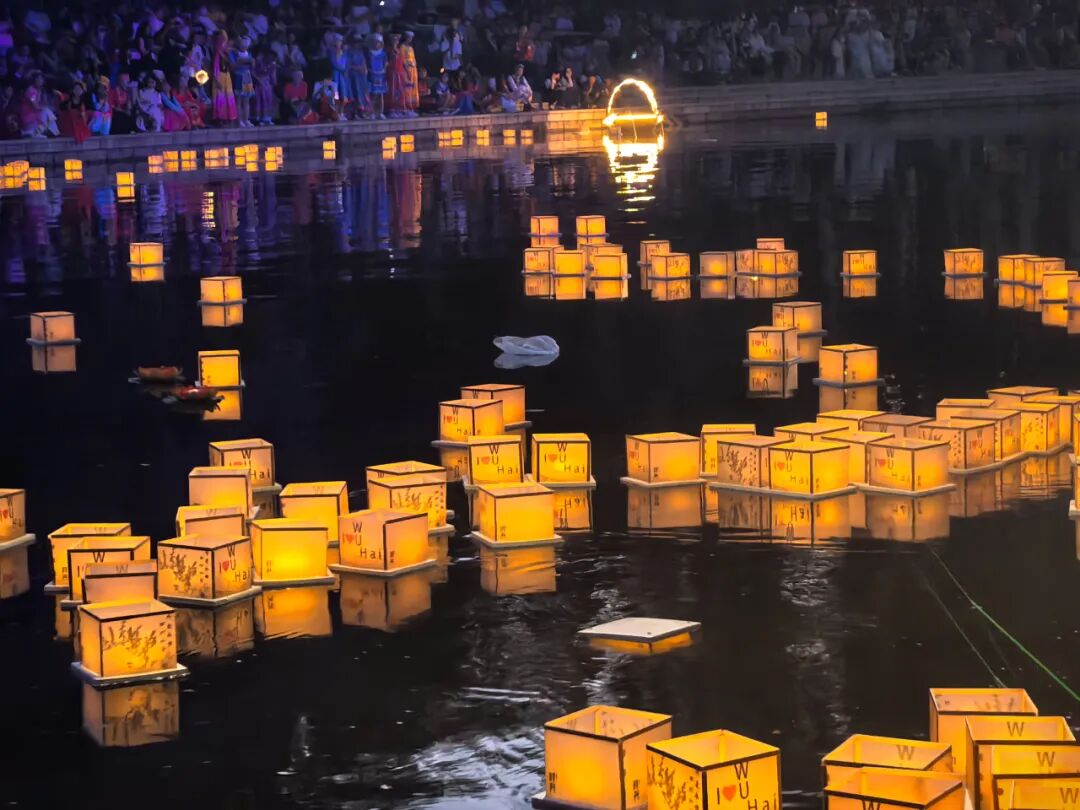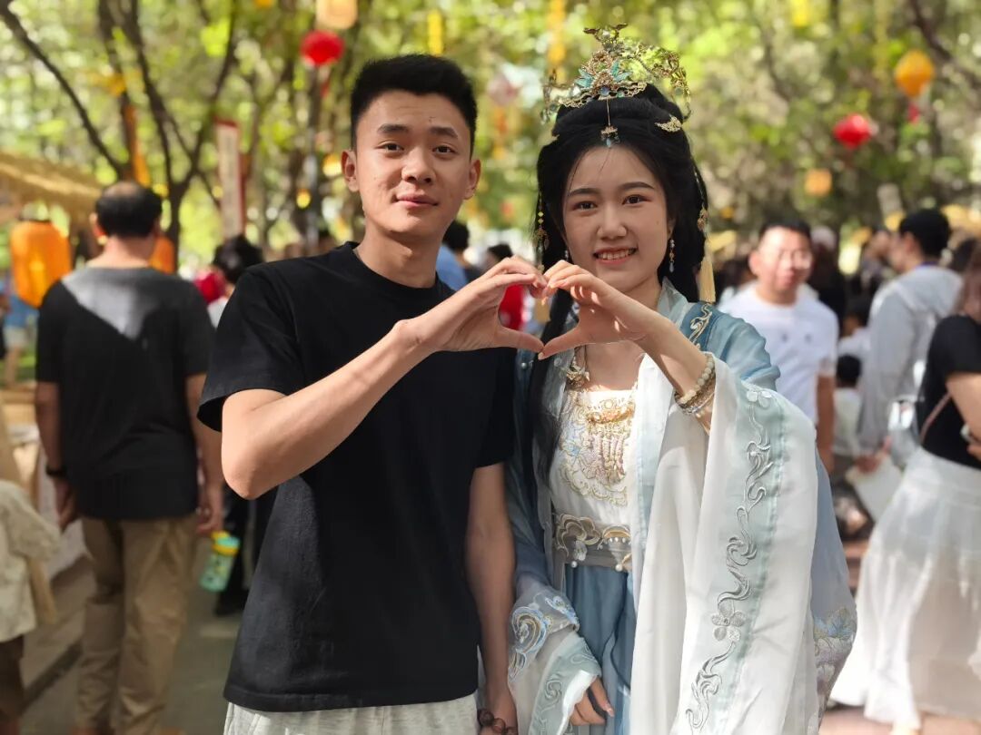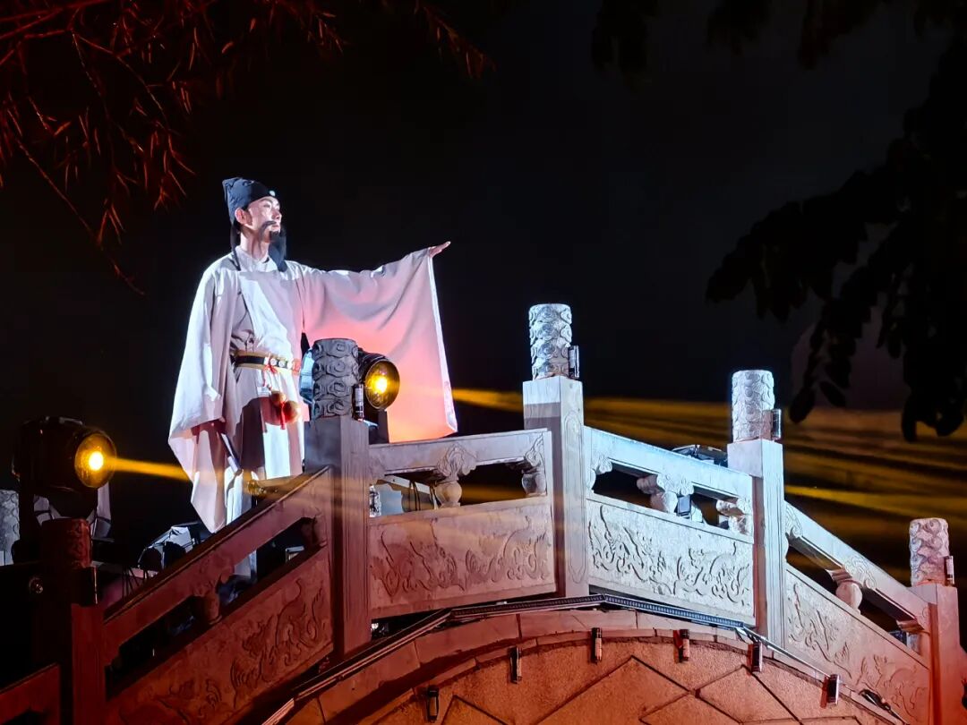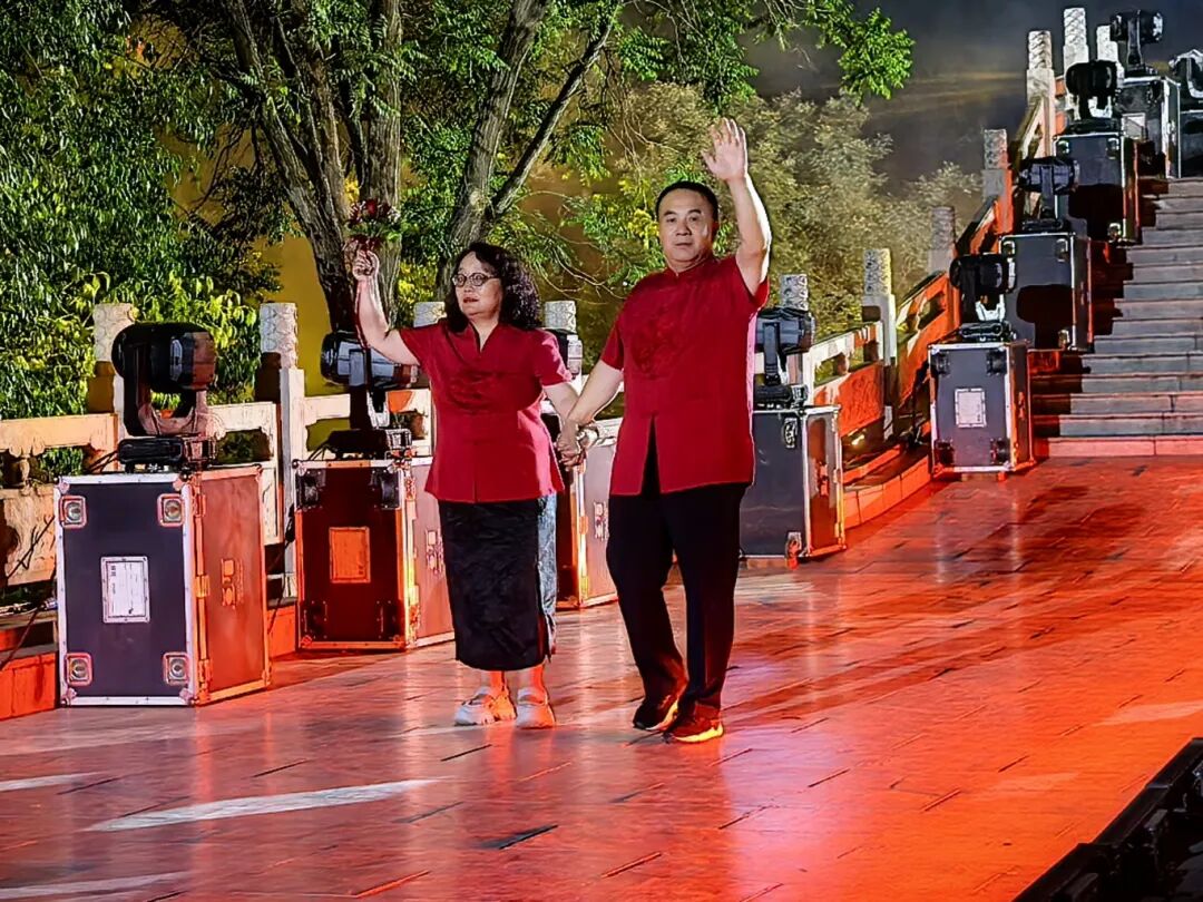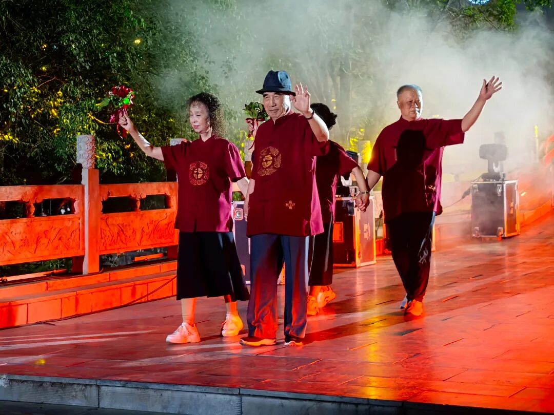傍晚时分,一场大型婚俗大秀由诗人吟唱的诗歌《行香子 七夕》拉开了序幕。“牛郎”吹着笛子乘船而来,缓步登岸,与“从天而降的”“织女”相会在“鹊桥”中央。二人在桥上双手紧握、含情脉脉,上演了一场唯美的爱情故事。随后,代表着金婚、蓝宝石婚、红宝石婚、珊瑚婚等7对夫妻先后步入幸福大道,为大家送上爱的祝福,寓意着忠贞不渝、幸福和睦的接力棒进行交接传递,将爱情的火种和培树文明家庭的理念继续延续下去。本次实景剧演出由本地导演刘东旭出任总导演并全程执导。 活动现场精彩不断,中国各朝代婚俗大秀为大家展示了周制婚礼却扇礼、汉制婚礼合卺酒、唐制婚礼掌灯纳福等七个时期的婚俗礼仪和服饰,让大家沉浸式感受各朝代精美婚礼画面,体会传统婚俗文化。
