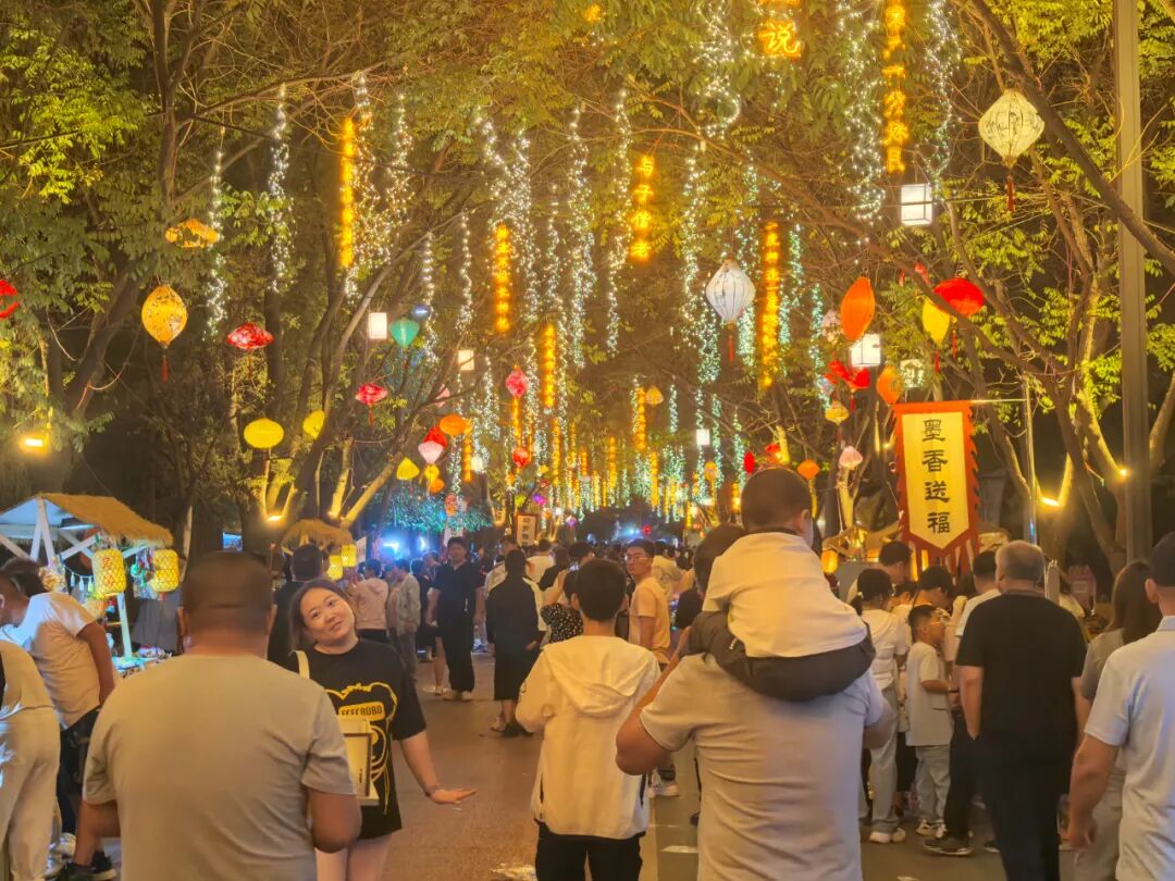 “礼乐投壶”、“以诗会友”、“诗词对答”……进入公园南门,国风集市上人潮涌动,市民、游客沉浸于古色古香的街道,体验古风民俗、参与趣味游戏、观看精彩表演,热闹非凡。